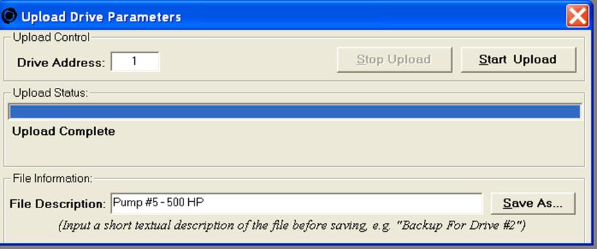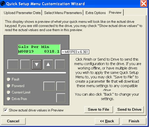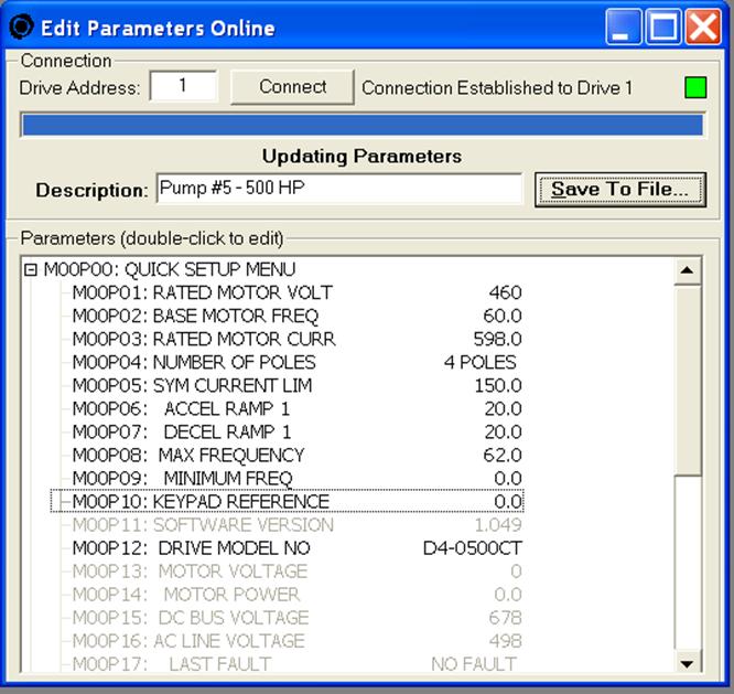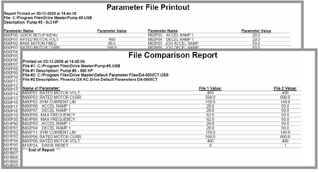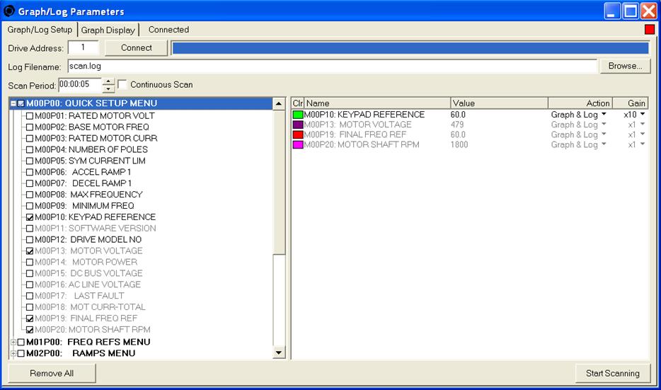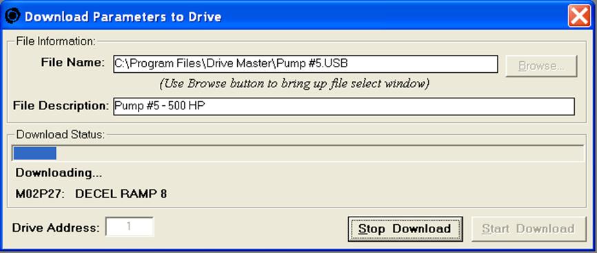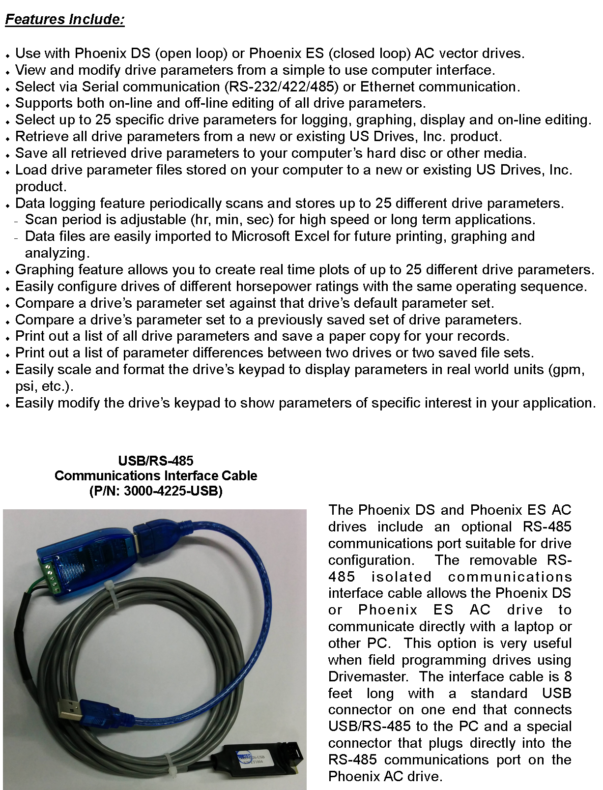 Drivemaster is a Windows based program designed to make drive set-up, record keeping and troubleshooting easy. Drive parameters can be extracted from a drive, reviewed, modified, printed, stored on disk, reloaded back into the same drive or copied to another drive. Data logging and graphing of drive parameters is also possible. Offline and online editing is supported.